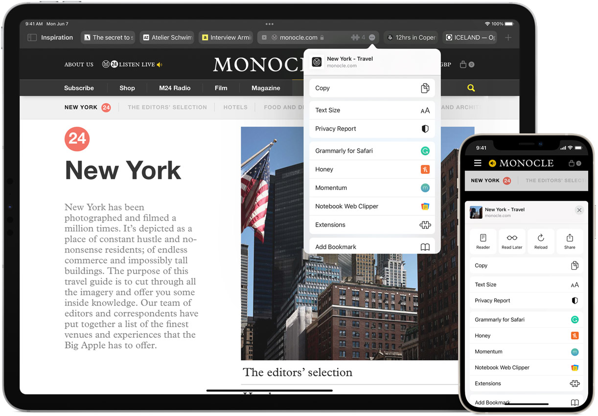 Переработанная панель навигации в Safari — это плавающая панель с адресом сайта и списком вкладок вместо стандартного tab bar. В браузере также появились расширения.