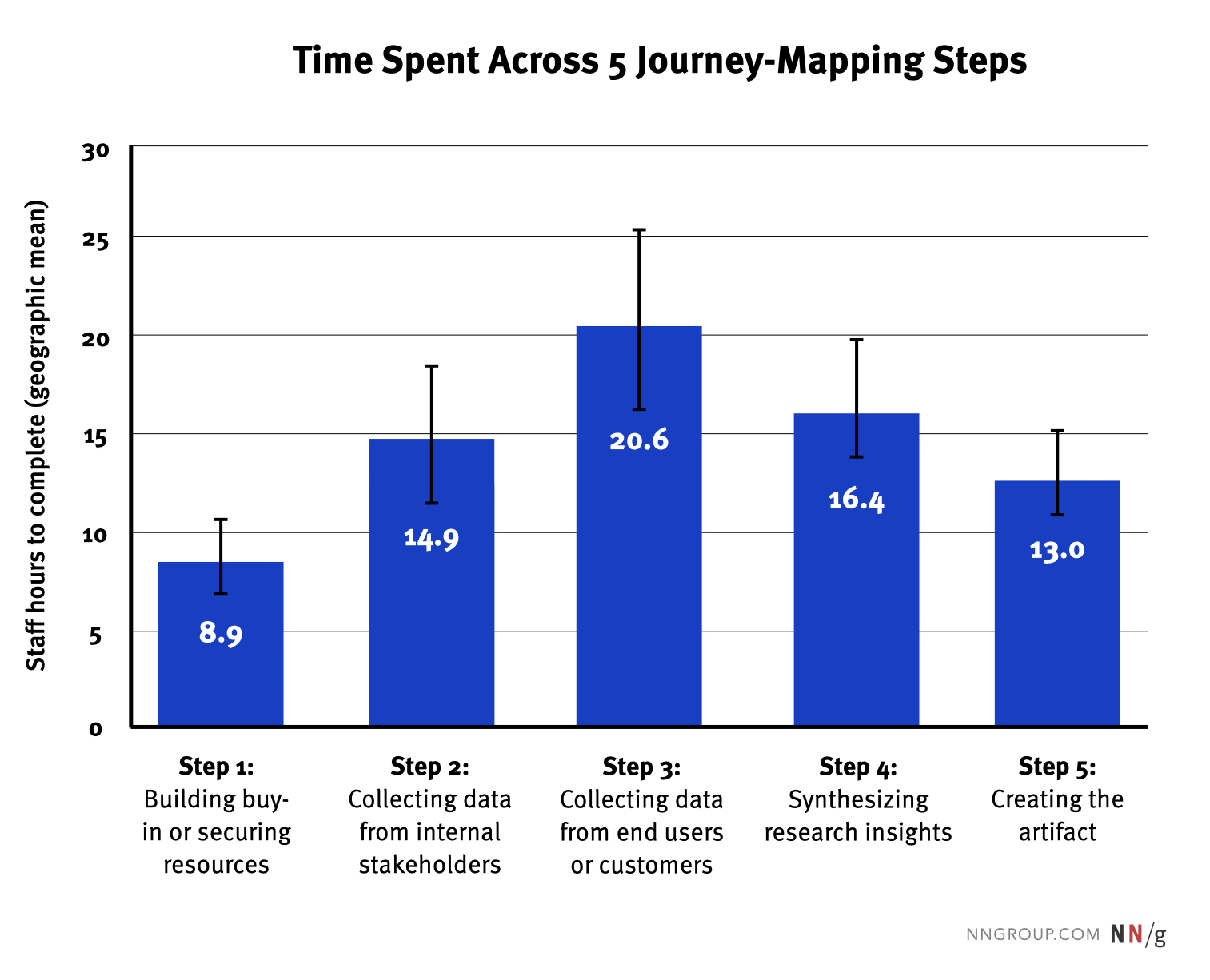 Kate Kaplan делится цифрами недавнего опроса Nielsen/Norman Group среди специалистов по интерфейсам: сколько времени занимает создание CJM? Если очень грубо — около 2 недель.