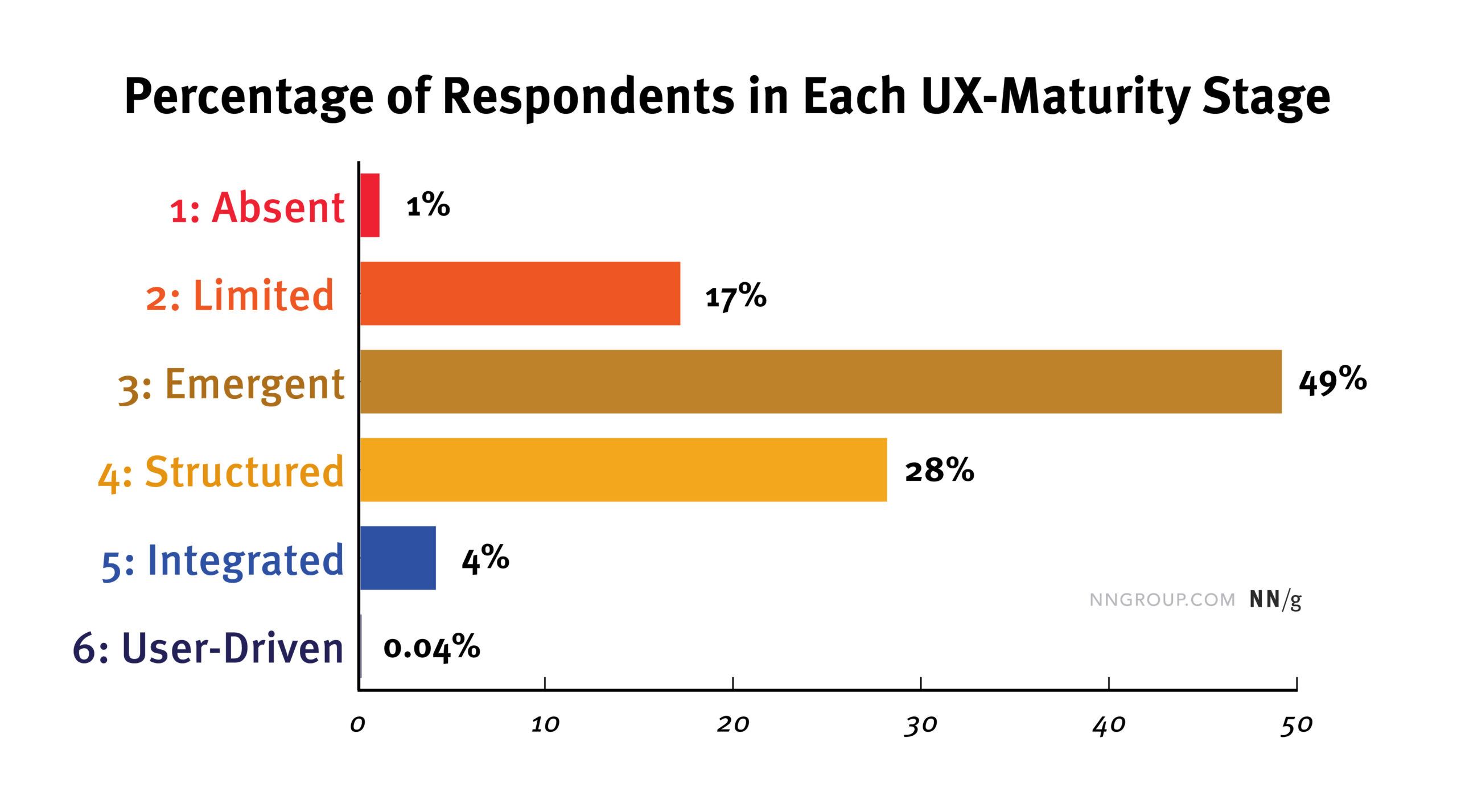 ?Kate Moran проанализировала оценку зрелости дизайна нескольких тысяч компаний по модели Nielsen/Norman Group. В прошлом году они выпустили инструмент самостоятельной оценки зрелости, которым воспользовались 5 371 человек. Основная часть находится на 3 и 4 уровне из 6, хотя это специфика выборки.
