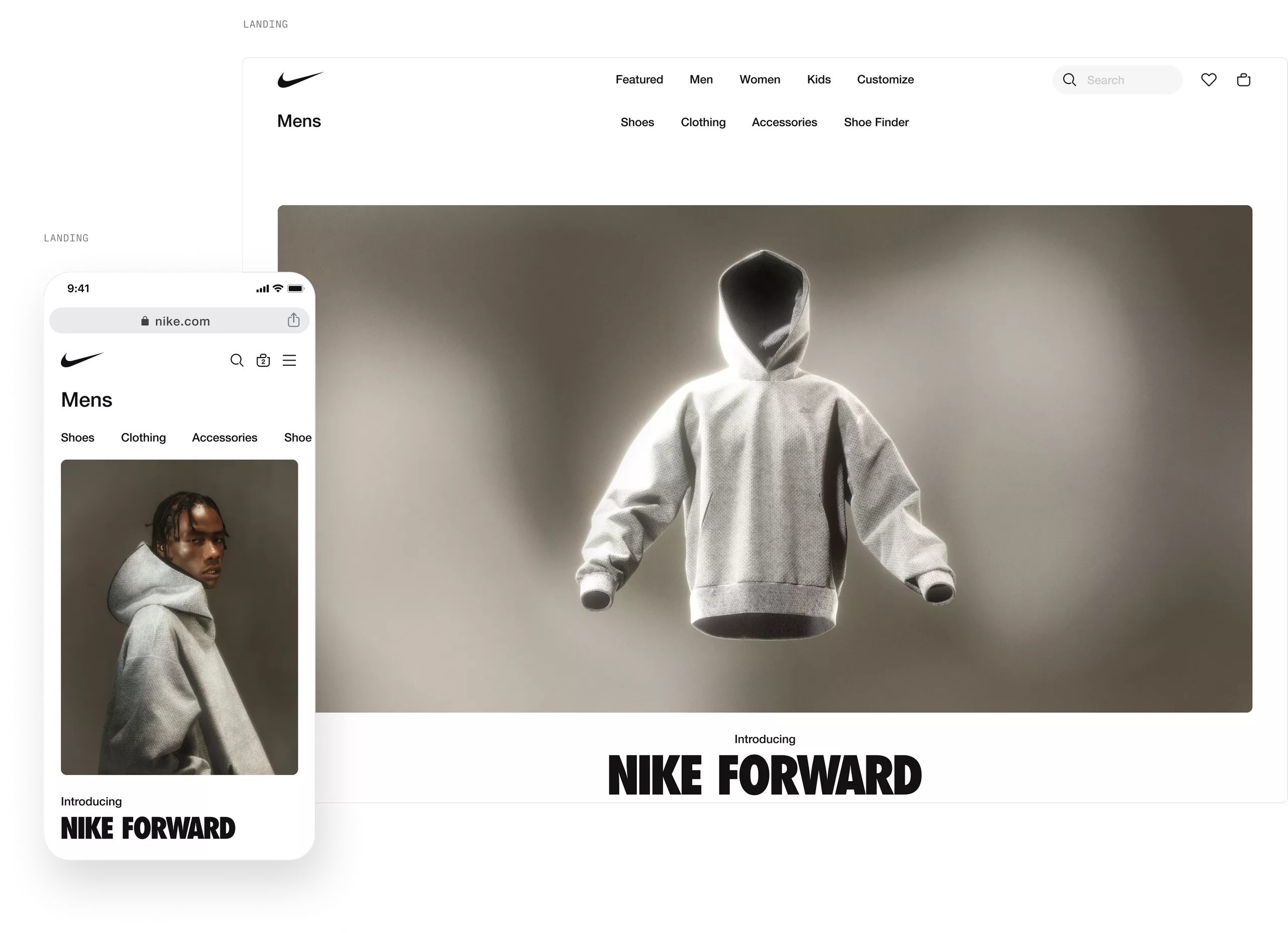 Антипример для Nike от агентства Instrument. Это яркий бренд с простейшими характерными базовыми приёмами, но для него сделали максимально бесхребетную и унылую дизайн-систему.