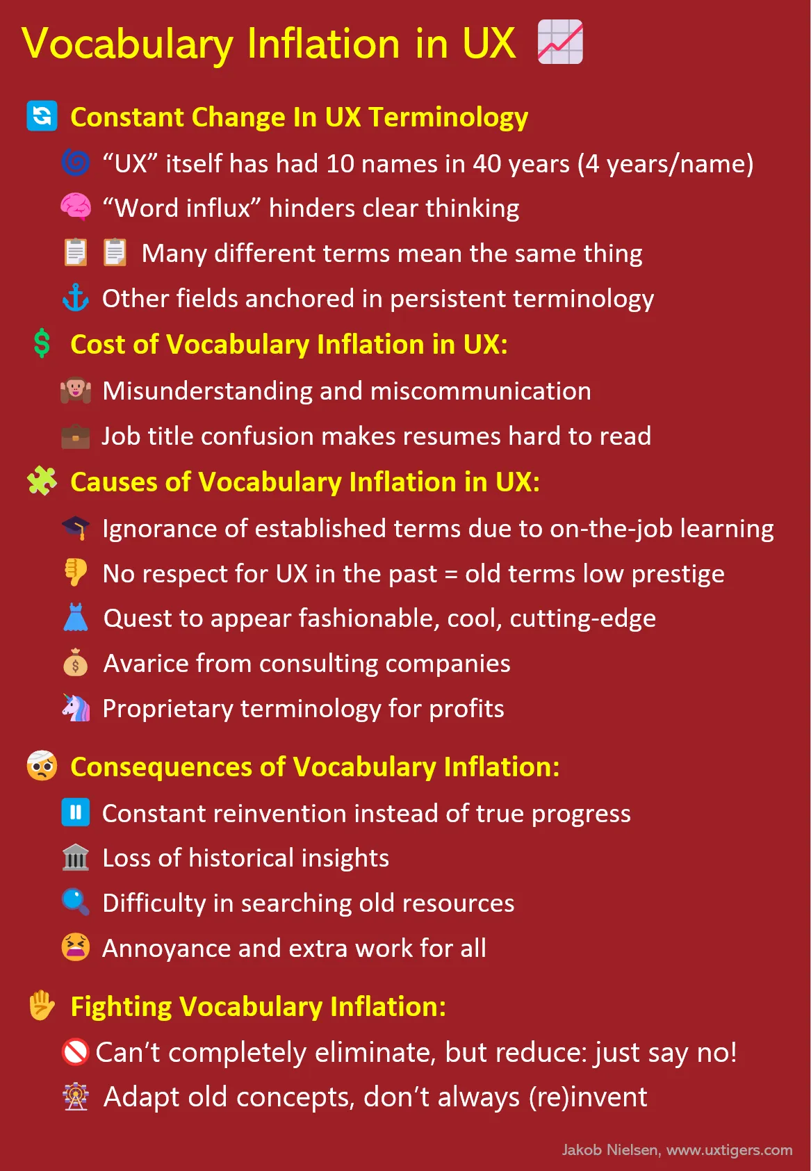 Jakob Nielsen критикует профессиональный маразм дизайнеров — инфляцию «терминологии». Одни и те же вещи раз в несколько лет получают другое название — только потому, что туда добавили немного нового смысла (ну или консультантам нужно забрендироваться). В итоге вместо решения сложных задач мы ходим по кругу и жалуемся, что не хватает методов и инструментов. Хотя реальная проблема в том, что значительная часть из них давно есть, просто толком не используется.